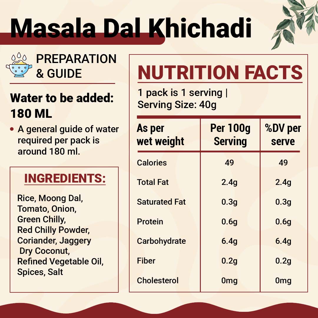 Masala Dal Khichadi is a flavour-rich version of traditional khichadi, made with aromatic spices and lentils. It offers deeper taste while maintaining the comfort and simplicity of a classic Indian meal.